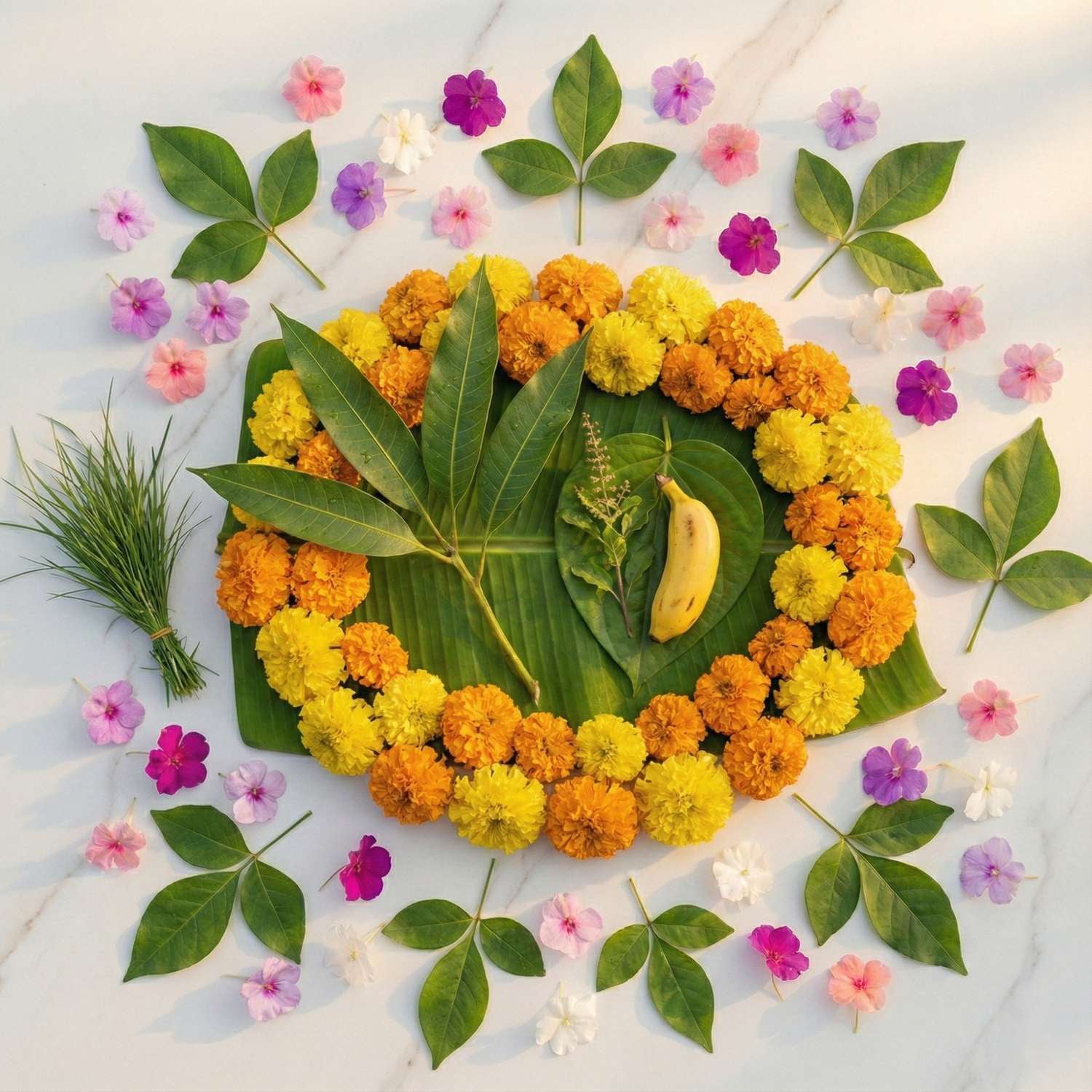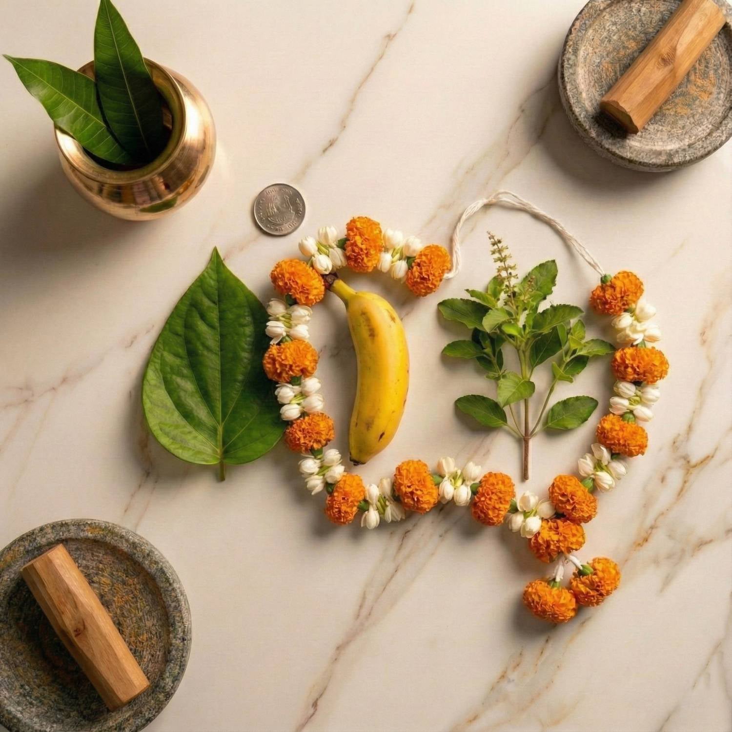 Balanced composition: loose flowers for pushpanjali, garland for ghot or deity decoration, and all essential leaves and items in one place.